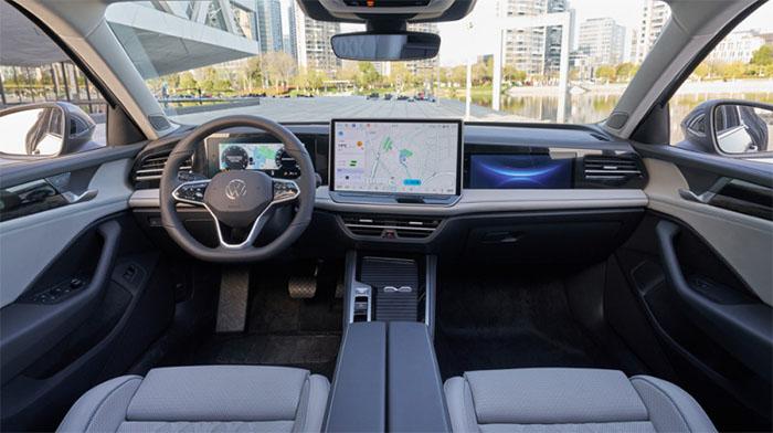 新一代一汽-大众迈腾车里,相比现款车型变化不小。新车采用了环抱式布局,中控台上配备了全液晶仪表、大尺寸悬浮式中控屏以及副驾驶娱乐屏三块大屏幕。