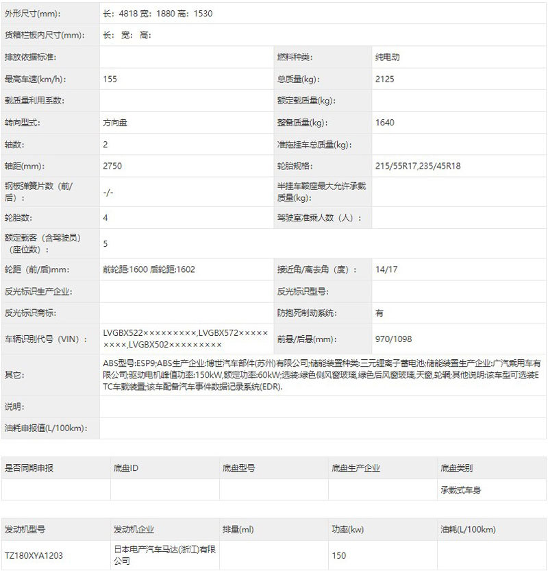 从申报信息来看,新车将搭载由广汽乘用车有限公司生产的三元锂电池,与之匹配是来自日本电产的驱动电机,最大功率为150kW,相比现款车型功率有所提升,最高车速可达155km/h。