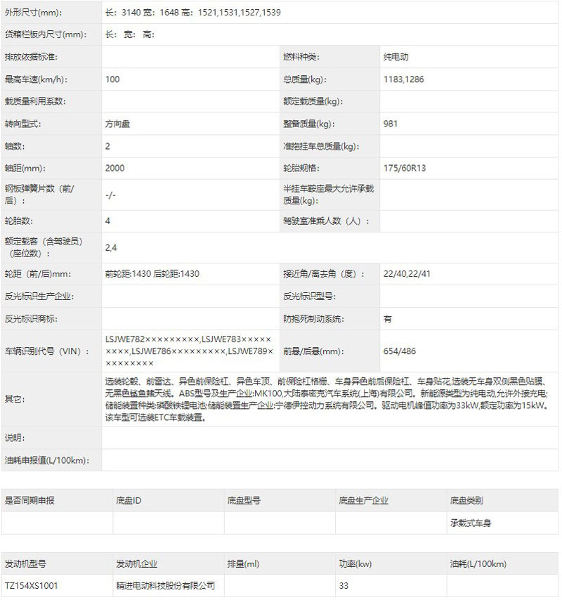 在车身尺寸方面,新车的长宽高分别3140/1648/1521(1531,1527,1539)mm,轴距为2000mm,整备质量为981kg。在动力方面,新车换装了最大功率为33kW的驱动电机,杏彩体育官网登录入口最高车速可达100km/h,并搭配磷酸铁锂电池。不过关于该车的续航里程目前还未公布。