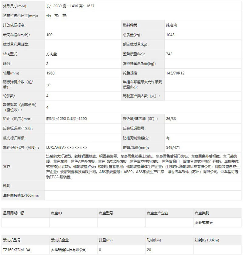 在动力方面,新车将搭载一台由安徽瑞露科技有限公司生产的驱动电机,最大功率为20kW,最高车速可达100km/h,并搭配磷酸铁锂电池。预计未来该车将与五菱宏光MINIEV等入门级电动车产品进行竞争。