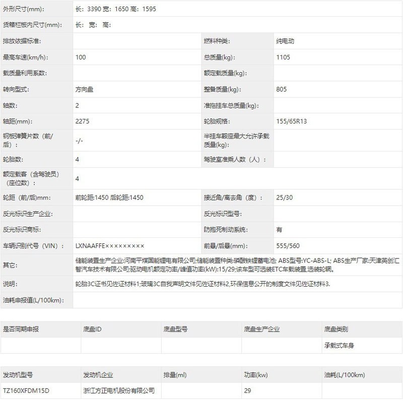 在车身尺寸方面,新车长宽高分别为3390/1650/1595mm,轴距为2275mm,整备质量为805kg。在配置方面,新车提供了铝合金和钢制轮辋可选,与之匹配的轮胎规格为155/65R13。在动力方面,新车搭载了最大功率为29kW的驱动电机,最高车速可达100km/h,并搭配磷酸铁锂电池。不过关于该车的续航里程目前还未公布。