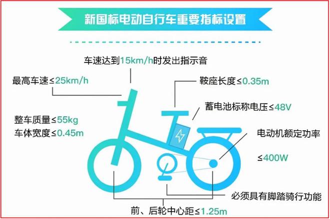 电动自行车要求整车质量小于55公斤,电池电压不高于48V,电机功率不大于400W,行驶速度最高为25公里/小时,同时车辆需要具备脚踏功能。