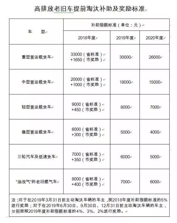 在省标准补助的基础上,对于在2019年3月31日前主动淘汰车辆的车主,按2018年度补助限额标准的5%进行奖励;