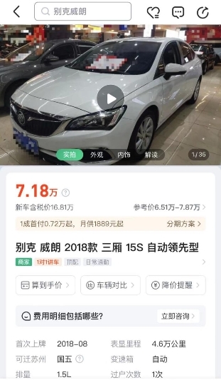 我打开app,上面的车型真的是琳琅满目,简直让人挑花了眼,我结合了一下手里的预算杏彩体育官网app,很快选中了一台别克威朗2018款三厢15S自动领先型。这款车不仅车况不错,里程只有4.6万公里,价格也很便宜,仅7.18万,页面上直观地展示了车子的内饰外观等,商家1对1在线讲车更是把车子的一点点小剐蹭也详细地加以说明,买家与车商可通过视频验车共同确认车况,验车视频保存三年。