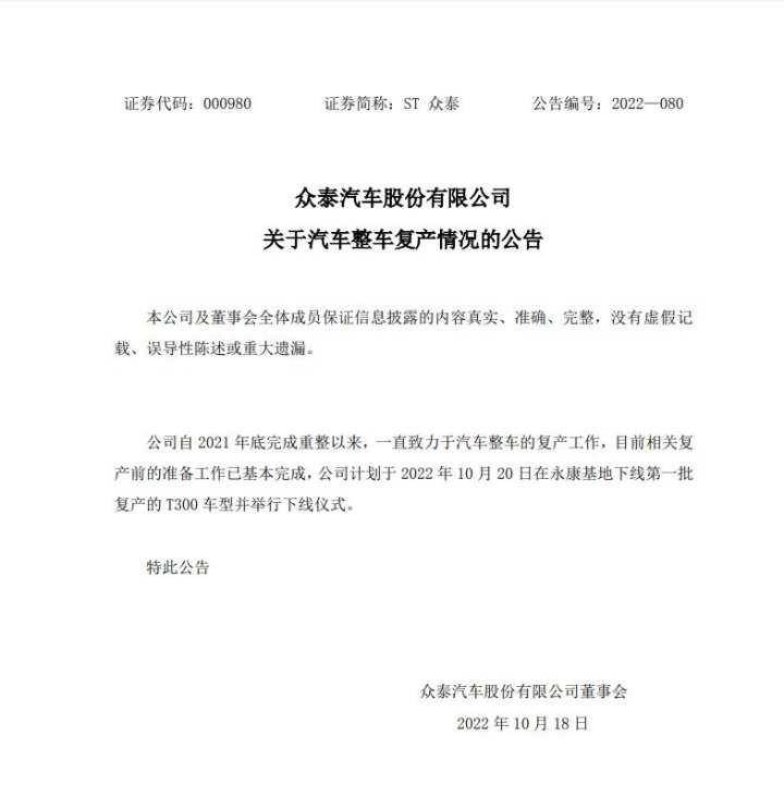 ST众泰公告显示,公司自2021年底完成重整以来,一直致力于汽车整车的复产工作,目前相关复产前的准备工作已基本完成,公司计划于2022年10月20日在永康基地下线车型并举行下线仪式。