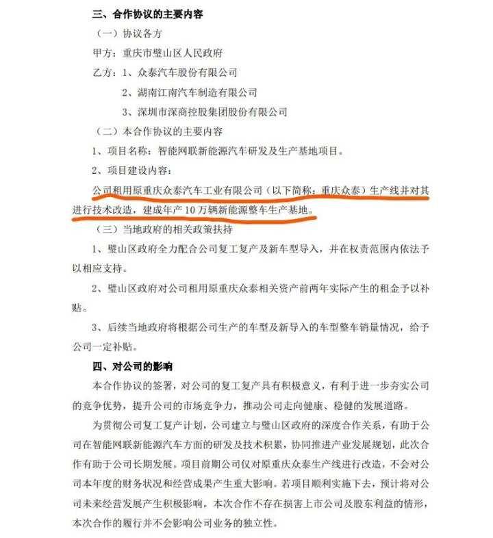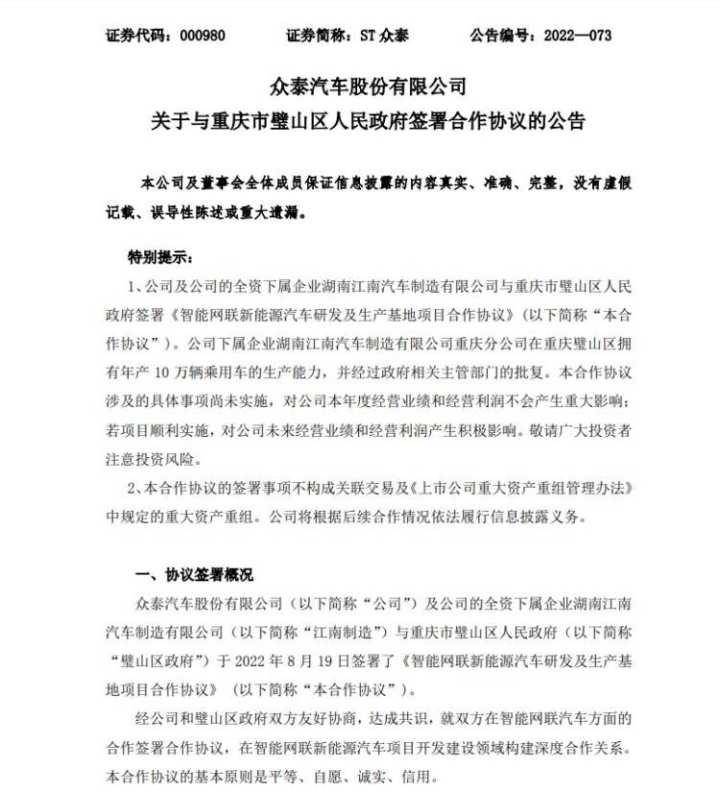 今年8月,ST众泰曾宣布,与重庆市璧山区政府达成合作,将在璧山投建智能网联新能源汽车研发及生产基地项目,改造并建成年产10万辆新能源整车生产基地。